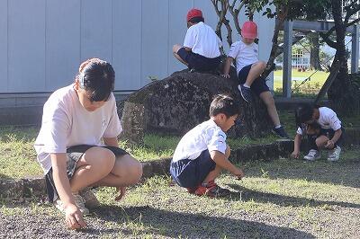 5月に植えたお芋の苗が立派に成長しました。1、2年生が芋ほりをしました。子どもたちは、移植ごてを上手に使って、ていねいにお芋を掘っていました。りっぱなお芋が採れると、「先生、見て~」とうれしそうにしていました。採れたお芋を何して食べようかな?