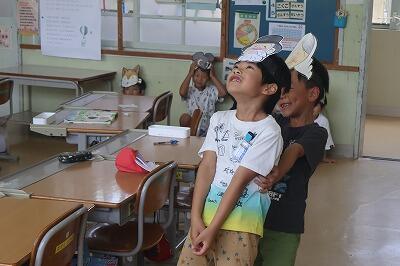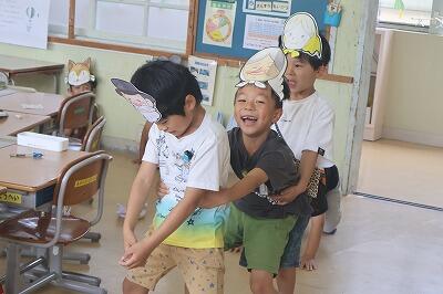 1年生が国語の教材「おおきな かぶ」を学習しています。今日は、お面をつけて、動作化にチャレンジしていました。みんな自分の役になりきってセリフを言ったり、動作をしたりしていました。とても楽しそうに活動していました。