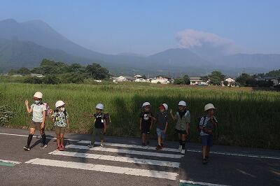 6月22日(日)に、新燃岳が7年ぶりに噴火しました。その時は、風向きの関係で、幸い狭野地区には降灰はありませんでした。しかし、26日の噴火から狭野地区にも降灰が確認されるようになりました。また、火山ガスも発生しているようです。子どもたちは、普段通りの学校生活を送っていますが、大規模噴火に備えて、予断を許さない状況です。万が一に備えて、ヘルメット携行とマスク着用は続きそうです。