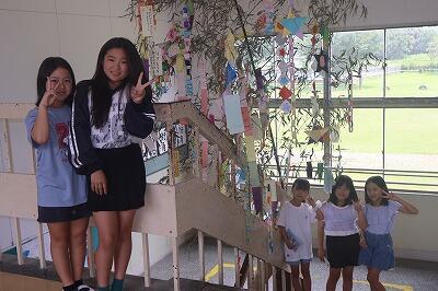 学校には七夕飾りが飾ってあります。いろいろな願いごとがありました。