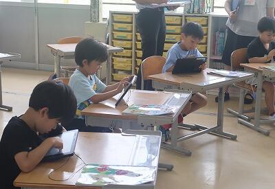 3年生と4年生が理科の学習をしていました。3年生は、虫メガネで光を集める実験をしていました。けむりが出ていました。4年生は、空気の実験をしていました。その実験の結果や考察をタブレットでまとめていました。実験を通して、新たな発見や気付きがあるようです。