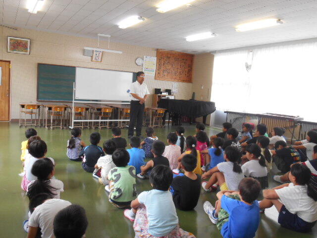 夏休みを前に、全校集会をしました。暑い日中は木陰を上手に使って遊ぶことや