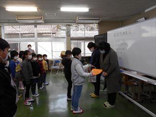 全校集会で、持久走大会入賞者と歯の治療をした子どもたちの