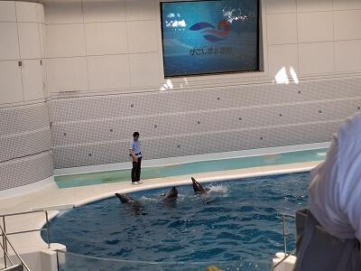 【水族館では、買い物に夢中でした。イルカのショーを楽しんで見ていました。】