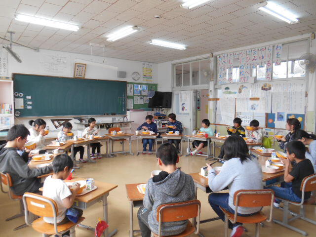 職員も交代で加わり、全児童・全職員と給食を食べます。