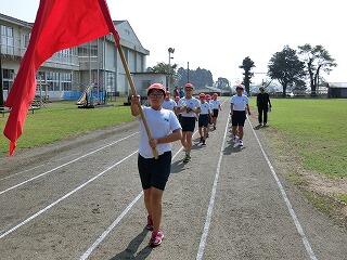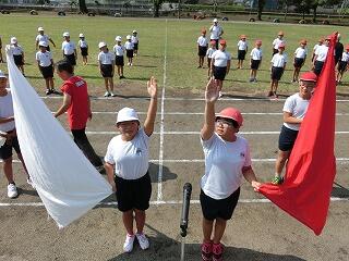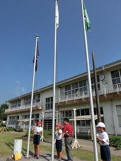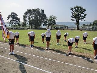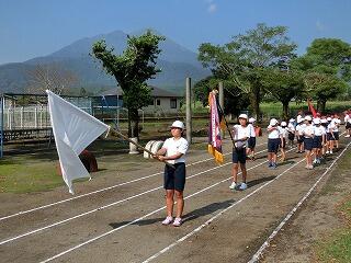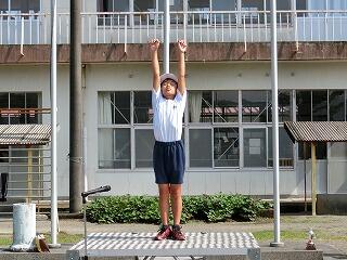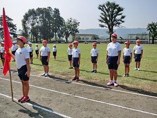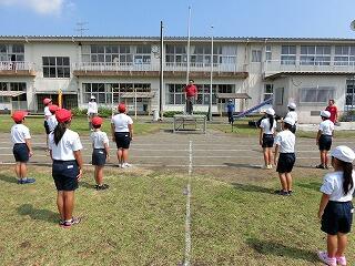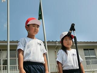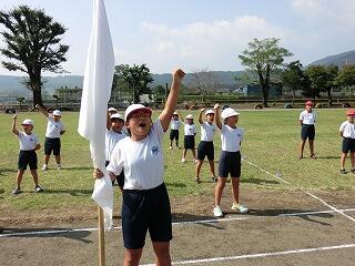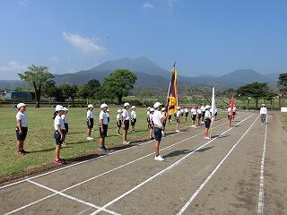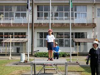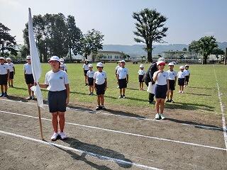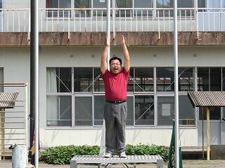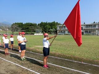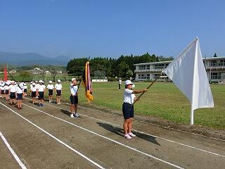 さあ、全校体育開始!国旗掲揚者。