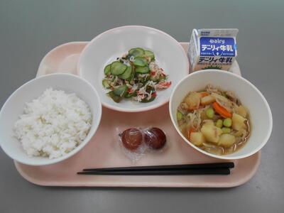 【9月20日】★久保ぶどう園さんからぶどうの差し入れ★ 麦ごはん、肉じゃが、きゅうりの酢の物、ぶどう、牛乳