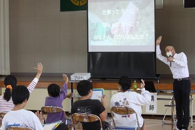 今回は、小林市の社会福祉法人ときわ会に講話を依頼しました。講師の下園先生には、「仕事(働く)ってな~に? 福祉ってな~に?」という題で、プレゼンや映像を用いて大変分かりやすくお話をしていただきました。子どもたちは、先生のお話を伺いながら、働くことの意味や福祉の仕事、あるいは福祉に携わる方々の思いについて理解を深めることができました。「将来、人に喜んでもらえる仕事ができるよう、コツコツと努力を積み重ねてほしい。」というお話には、狭野小の先輩でもある下園先生の後輩に対する愛情(エール)を感じました。本当にありがとうございました。