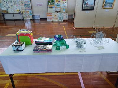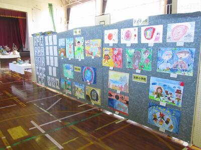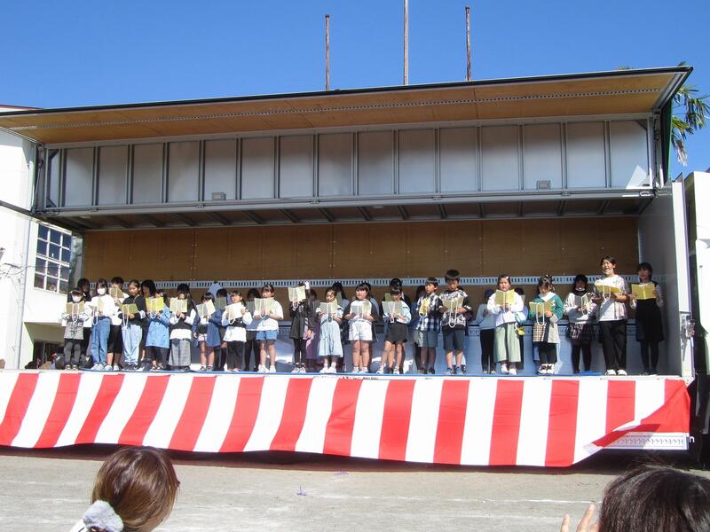 10月22日(日)に高原町日本発祥地まつりが行われました。高原小のグラウンドで行われた昼の部の発表では、狭野小からもジュニアコーラスの練習を重ねてきた4名の児童が参加しました。また、町民体育館では、町内の子どもから大人の方々の作品が展示されており、狭野小からも代表に選ばれた読書感想画・意見発表・標語、書写・絵画・工作の各作品が展示されていました。
