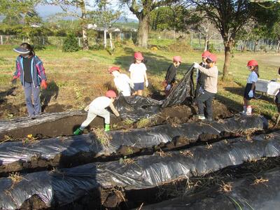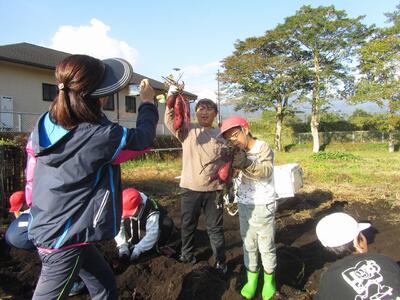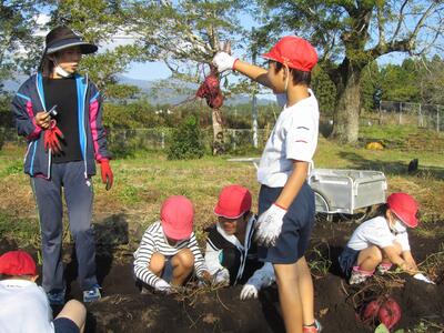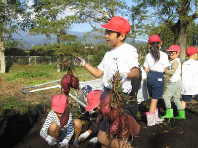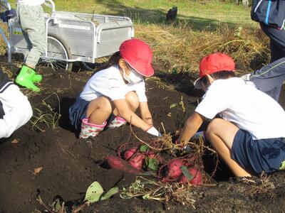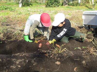 10/31(火)の1~2時間目に、1・2年生が狭野小の校庭にある農園「さのっこ園」で『いもほり』をしました。自分たちが植えた「紅はるか(40本)」と「安納芋(40本)」。大きく育っているかどうか、わくわくドキドキ。マルチを剥がしたときサツマイモの姿が見えると歓声、大きなサツマイモを掘りだしたときの笑顔。自然の恵みと丈夫な苗を育ててくださった農家の方、そしてトラクターで畑を耕してくださったPTA会長さんに感謝です。ありがとうございました。掘り出したサツマイモは、水で洗ってベランダに干し、みんなで分け合って持ち帰りました。他の学年や先生たちにもお裾分けしてくれる優しい1・2年生でした。