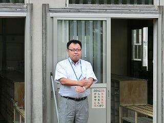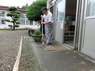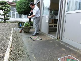 教頭先生、児童のために早朝より児童玄関はわき・水まき。