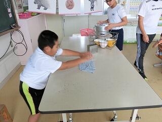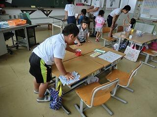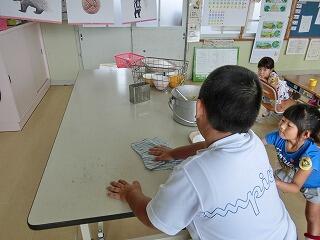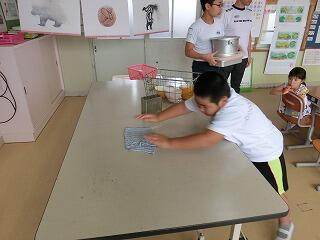 さのっこ一年君、大きな台は手が届かないので、あっちで拭いて、雑巾置いて、こっちで受け取って、こっちを拭いて、雑巾置いて、あっちに行って、あっちを拭いて・・・。そんなピストンふきをていねいにしてくれているのでした。