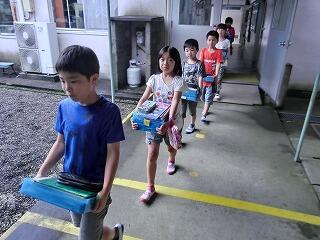 その頃、5年生は、音楽室から6年教室へ移動中。