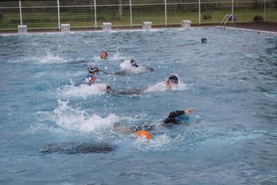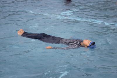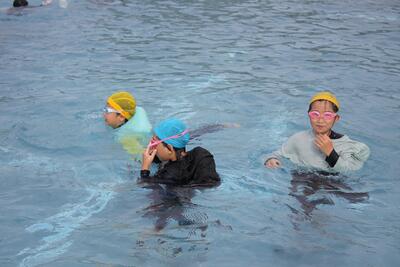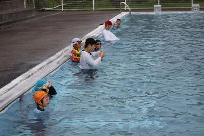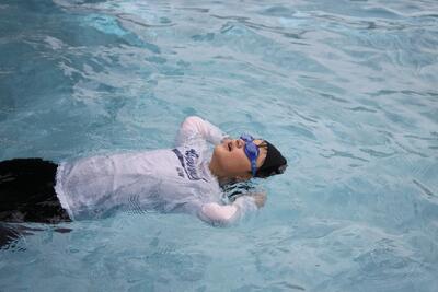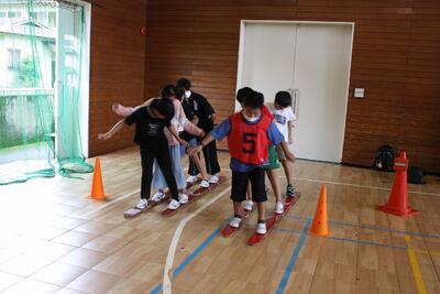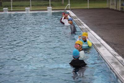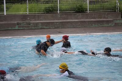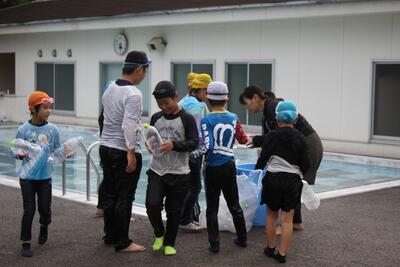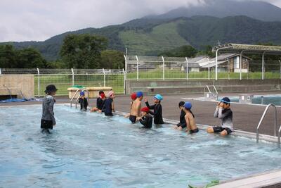 7月20日(木)に3年~6年生が『着衣泳』を行いました。水着の上からシャツやズボンをはいて水に入り、水着だけのときとは違った感覚を味わい、もし水に落ちたときの浮き方を練習しました。ペットボトルをどのように使えば浮きやすいか試しました。