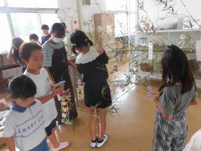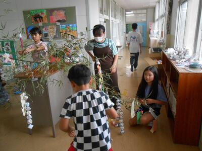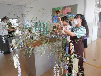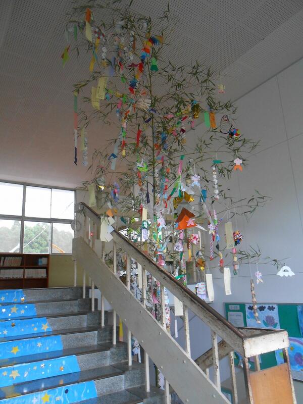 今日は7月7日、七夕です。昼休みに七夕飾りを行いました。1・2年生が作った飾りと全校児童・職員が書いた短冊に加え、小林地区更生保護女性会及び地域のN様からいただいたたくさんの七夕飾りを飾りました。笹竹は、学校の近くのKさんに提供していただきました。ありがとうございました。狭野小に来られた際は、南校舎階段の七夕飾りをぜひご覧ください。みんなの願い事が叶いますように・・・。