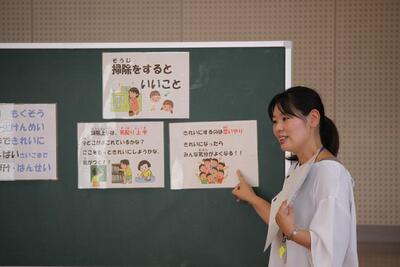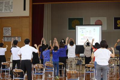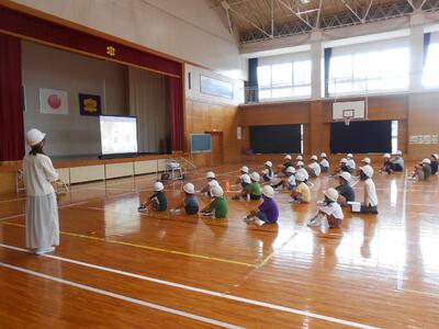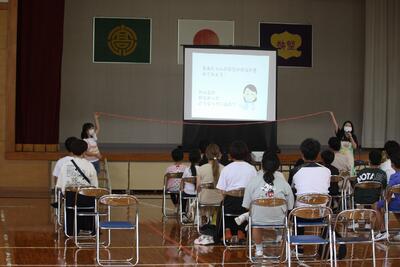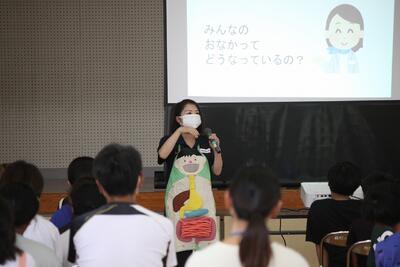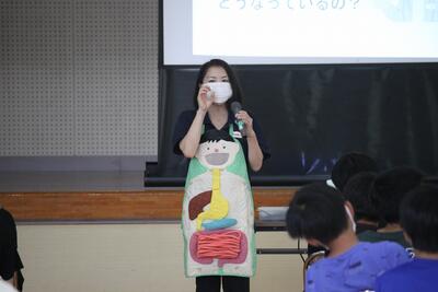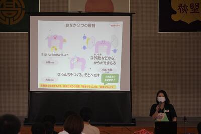 また、今回は、授業参観と学級懇談会に加えて保護者と3~6年生を対象に「学校保健委員会」を行いました。都城ヤクルト販売の方に講師を依頼し、『食育教室』という題で食べたものが体の中でどのように消化されていくのか、健康な体を維持するためにはどのようなことに気を付ければ良いのかについてお話をしていただきました。参加した保護者の皆さん・3~6年の児童・職員それぞれが、お腹の中の良い細菌が活発に働けるようにバランスの良い食事や適度な運動を日常の生活に取り入れたいと感じたようでした。講師の先生、分かりやすいお話をありがとうございました。