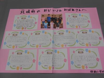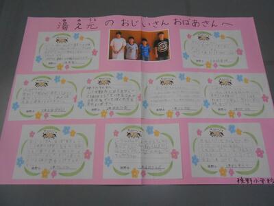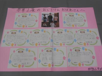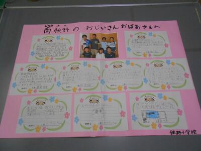 狭野にいらっしゃる高齢者の皆様も、戦時中から戦後にかけて相当な御苦労をなされたのではないかと思います。狭野小学校は、今年創立151年目を迎えますが、今私たちがこうして学校生活を送ることができるのも地域の皆様のおかげであると感謝しております。狭野小では、地域のおじいさん・おばあさんに日頃の感謝のメッセージを書き、先日それぞれの地区にお届けしました。これからどうぞお元気でお過ごしください。