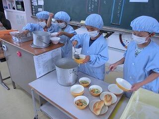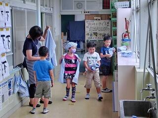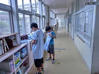 他学級を見ると、あの、エプロンのたたみ方の時間。