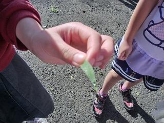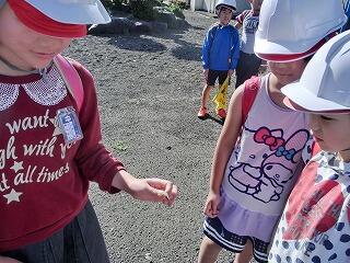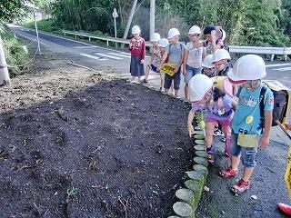 用務の先生がひまわりを植えてくれたよ、と紹介すると、みんなで双葉を見つけて嬉しそう。