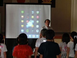 プレゼンテーションを活用して、口之永良部島の状況、新燃岳だけの被害の様子等を伝え、私たちにとても深い関係のあることなんだよ、と指導しました。さのっこ、全員、真剣にプレゼンを見つめていました。