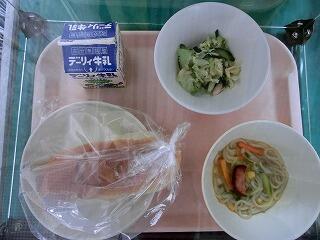 今日の給食はラーメンでした。サラダも付いて、野菜いっぱい!