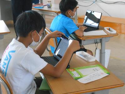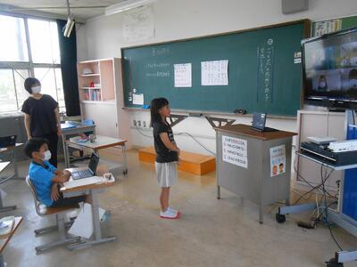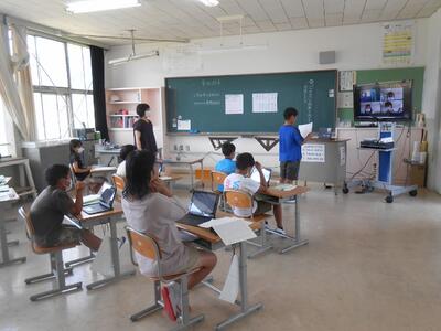 4年生8名が国語の授業で『一つの花』の感想を読んで交流しよう、というテーマで、後川内小学校の4年生と交流授業を行いました。タブレットPCを用いることで、様々な感想について、リアルタイムで発表を聞き、質問することができるので、少人数の学校にあっては、物語文についての理解をさらに深めることができると感じました。