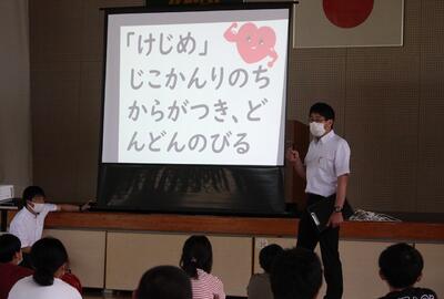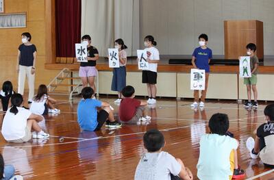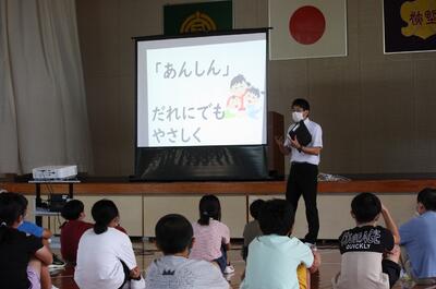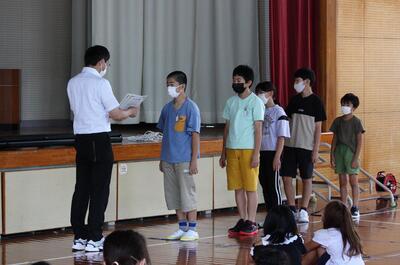 夏休みを前に全校集会がありました。校長先生からは、1学期を振り返って「3つの『あ』」のお話がありました。「あんしん」「あんぜん」「あいさつ」を心がけて生活することの大切さを改めて感じることができました。また、夏休みの過ごし方について、気を付けるべき「スイカニンジャ(水、火、人、車)」のお話や「チョボラ」や青少年健全育成標語の表彰等もありました。夏休みに狭野小を転出する〇〇〇さんと〇〇さん、寂しくなりますが、新しい学校でも元気に頑張ってくださいね。