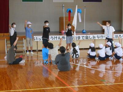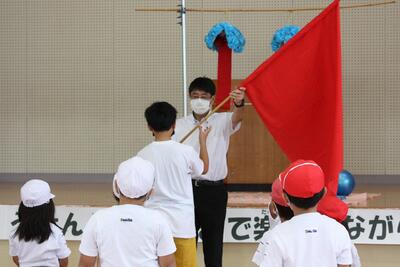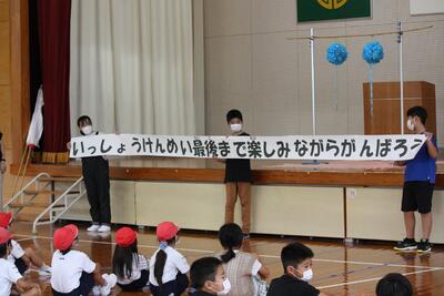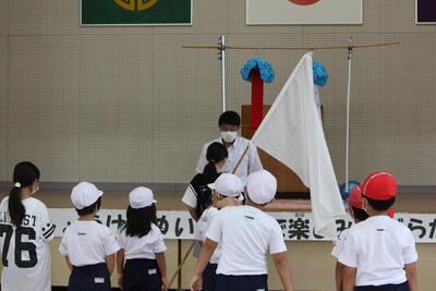 9/2(金)に運動会の結団式がありました。スローガン『いっしょうけんめい最後まで楽しみながらがんばろう!」の紹介の後、A団・B団対抗のボール渡しゲームを取り入れた団色決定、団旗授与、団ごとのリーダー挨拶を行いました。白団・赤団とも、団長を中心にこれからの練習を頑張っていきましょう!!