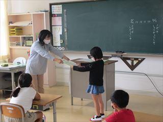 今日は、1学期終業の日でした。終業式では、校長先生の話と作文発表、表彰がありました。作文発表は、3年児童が、「1学期にがんばったこと、2学期にがんばりたいこと」を発表しました。自分の伝えたいことや気持ちを上手に表現した素晴らしい作文発表でした。表彰は、歯、多読賞や漢字検定の表彰がありました。また、終業式の後は、教室で「あゆみ」をもらいました。1年生にとっては、はじめての「あゆみ」でした。