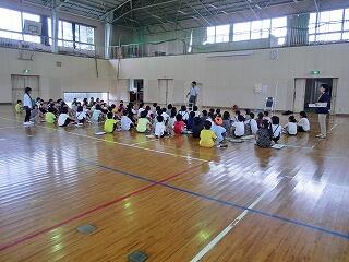 高原小では、5年生の交流学習が行われ、体育館で集団宿泊学習とふるさと学習の話合いが高原町全5年生77名で行われました。給食も高原小で食べました。