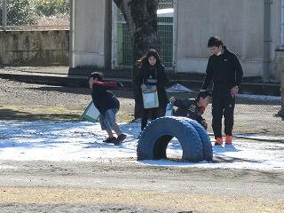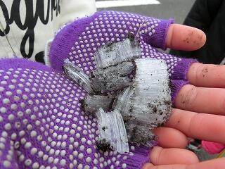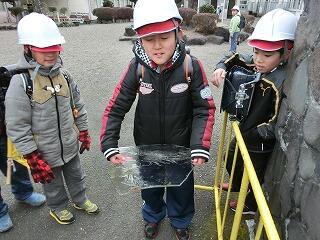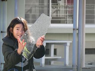 遊びの天才、4年生。さっそく見つけた、日陰の氷。