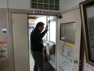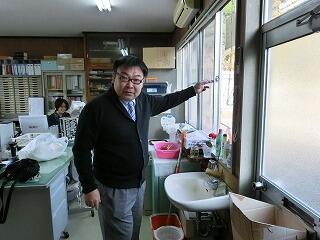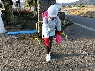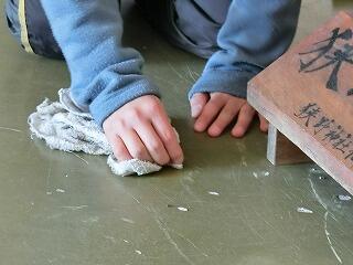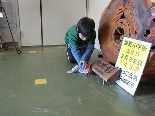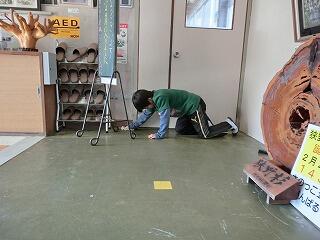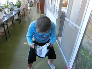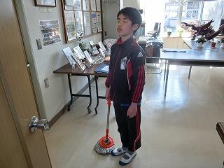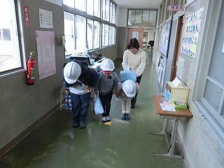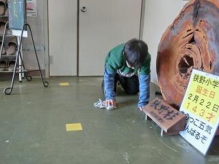 廊下に出てみると、事務室・玄関担当さのっこ、集中した清掃中。