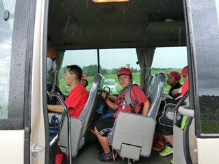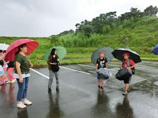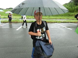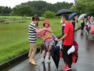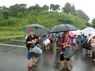 土砂降りの雨の中、集合する5年さのっこ。