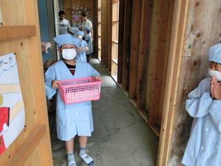 給食室・・・いたいた。緊張の当番さん。