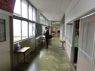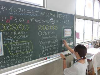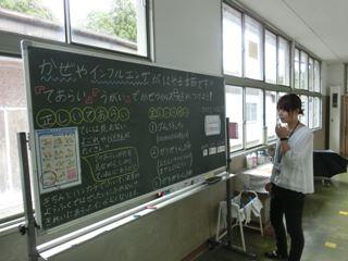 保健室前の廊下に、移動黒板を置いて、保健室先生、専用にしています。