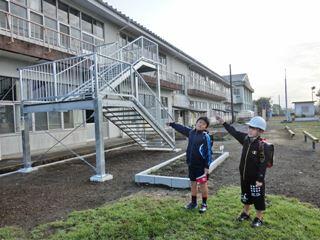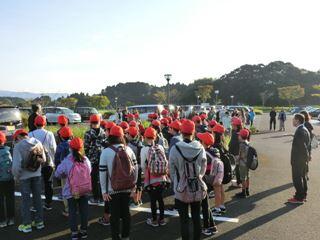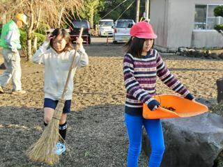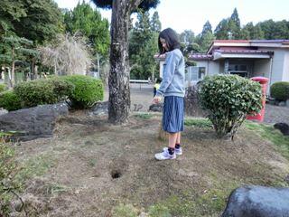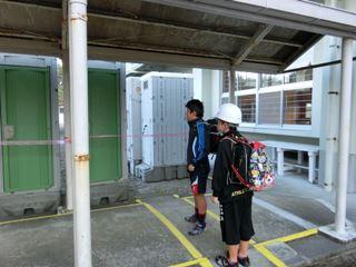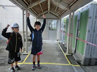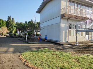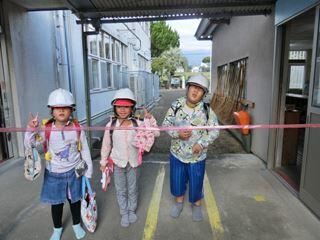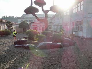 児童玄関で・・・。さのっこたちにおもてなしの心。石一つない児童玄関で出迎える。