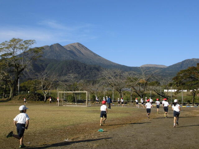 冷え込む朝ですが、高千穂がきりりと見える運動場を、