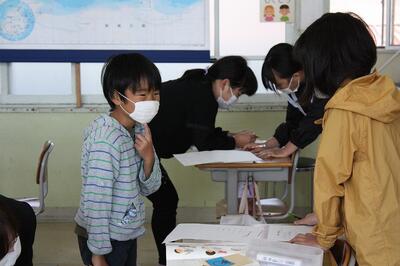 1・2年生は、生活科で「ともだちのことやがっこうのことをいっぱいしろう」というめあてで授業をおこないました。先生が言った方向と反対に体を動かすアクティビティで体をほぐして、自己紹介→名刺交換→学校のことを学ぶ学習を行いました。全員、元気な声で自己紹介をすることができました。