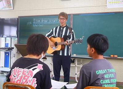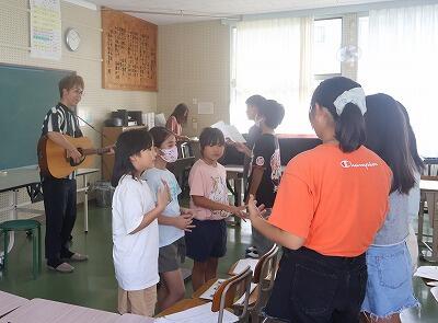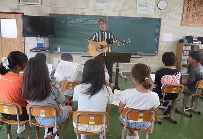 10月6日(日)に大野勇太さんのコンサートが狭野神社で開かれます。そのコンサートに狭野小の子どもたちが参加することになりました。参加するのは、Jr.コーラスのメンバーと数名の希望者です。今日は、本番に向けて、大野勇太さんが狭野小に来てくださって練習をしました。歌う曲は2曲で、曲名は当日のお楽しみです。子どもたちは、大野さんのギターに合わせて練習しました。大野さんありがとうございました。しっかり練習して本番に臨みたいと思います。