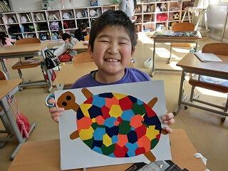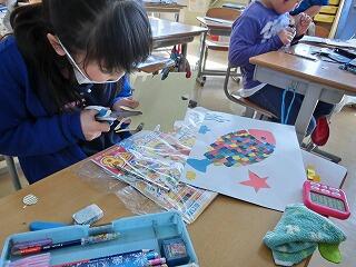 カラフルなシールを張り詰める、きれいなきれいな作品が、生まれようとしています。