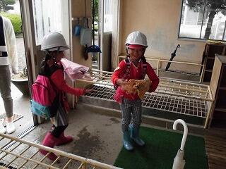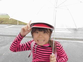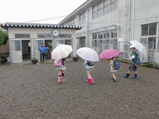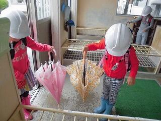 仲良く、傘をとんとんとん!雨のしずくを全て落とします!