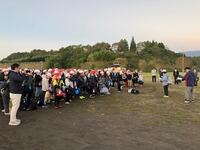 11月7日、8日の二日間、高原町4校合同の修学旅行です。澄み渡る秋空のもとで、出発式を終えて元気に出発しました。まずは有村溶岩展望所を目指します