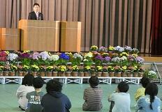 中学生が育てたお花と一緒にありがとうの気持ちを伝えました。