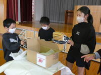 少年野球部の子どもたちと一緒に箱を開けました。その後、キャッチボールをしてもらいました。