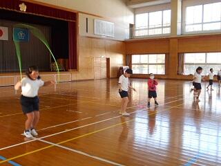 なわとび大会 投稿日時 : 2021/02/04 学校管理者 なわとび大会をしました。 感染防止のため、個人跳びの発表のみとしました。 1・2・3・4年生は、一人ずつ1分間発表しました。1・2年生は、前回し、かけ足、片足跳びを、3・4年生は、二重跳びを発表しました。引っかかってもすぐに跳び始めて1分間一生懸命跳ぶ姿に成長を感じうれしく思いました。 5・6年生は、数人ごとの発表後、曲に合わせて集団で様々な技を披露しました。見ている人に、「こんな技ができるようになりたい。」と思わせるような、かっこいい発表でした。寒さに負けず体力も向上した1・2月です。
