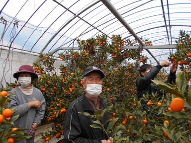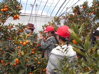 きんかんの収穫体験 投稿日時 : 2021/02/12 学校管理者 温水さんのきんかん畑で、収穫体験をさせていただきました。 完熟した大きなきんかんがたわわに実る木が、ハウスに広がる光景に、子どもたちから歓声があがりました。二人一組で、教えられた通りに500円玉ほどの実を、収穫し、いただいた袋やポケットがいっぱいになりました。 地域で立派なきんかんが栽培されていることを知るとともに、収穫体験で貴重な学びをさせていただきました。家族で食べるのも楽しみでしょう。ありがとうございました。