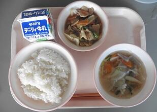 今日の給食の献立は、「むぎごはん、けんちん汁、豚肉のあまから炒め」でした。今日の給食は、小林市野尻町の(株)ピッグファーム嶺石様より豚肉を無償提供いただき、その肉を使った献立で給食を作らせていただきました。子どもたちも職員も、「おいしー」と言いながら笑顔で食べていました。