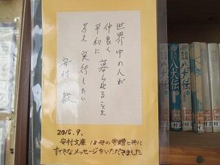 安村文庫 投稿日時 : 2019/10/16 学校管理者 図書室に「安村文庫」があります。戦時中に沖縄から後川内地区に疎開してこられた方々の一人、安村様がその時のお礼として本校の子どもたちに寄贈してくださった図書です。今年も先日、お送りいただきました。中学校になると修学旅行で安村様宅を訪問するなど現在も交流を続けさせていただいています。安村様の願いである「平和」な世の中の実現を願っています。 Tweet