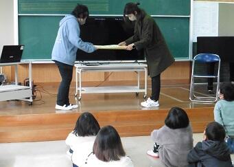 校長先生、生徒指導主事の話では、安全な自転車の乗り方や不審者に気を付けることなど、命を守ることを中心に、冬休みの安全な過ごし方について話をされました。表彰では、「小学生の税に関する絵はがきコンクール」、「人権ポスターコンテスト」、高原町陸上教室の入賞、体力テストの体力賞の表彰が行われました。