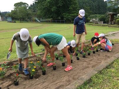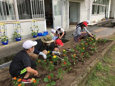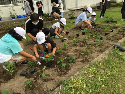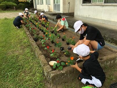 うしろキッズで苗植え 投稿日時 : 2021/06/25 学校管理者 用務員の留山さんがたくさんの苗を育ててくださいました。子どもたちは、1~6年生が入った縦割り班「うしろキッズ」で、受け持つ花壇を決めて、苗植えをしました。 毎年行っているため、上学年児童が教えながら、たくさんの苗を時間内に植え終わりました。お世話をしていきます。花が咲きほこるのが楽しみです。